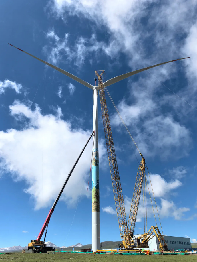 7月5日,海拔4700m的藏北高原,在一臺800T履帶式起重機(jī)與兩臺100T汽車起重機(jī)輔助下,西藏開投色尼區(qū)曲果嘎姆200MW風(fēng)電項目13#風(fēng)機(jī)風(fēng)力發(fā)電機(jī)組葉片與輪轂緩緩升起,于10:45順利與機(jī)艙完成對接,標(biāo)志著該項目首臺風(fēng)機(jī)順利完成吊裝。